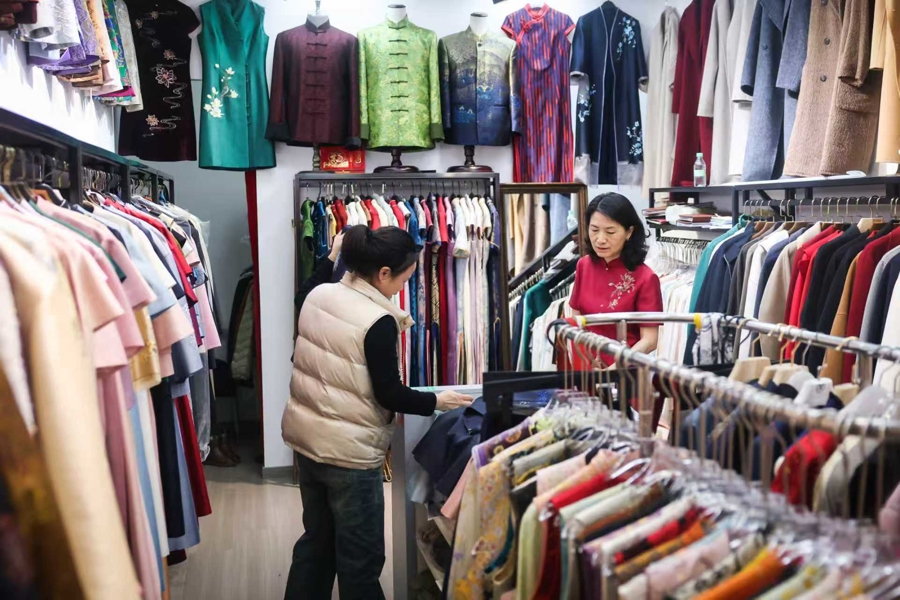 临近春节,黄浦区陆家浜路399号的上海南外滩轻纺面料市场里一派热闹景象:剪刀划过布料的簌簌声,与多语种的交谈声交织;中外消费者挑选面料、敲定版型,定制西装、旗袍、中式礼服的订单排起长队。
