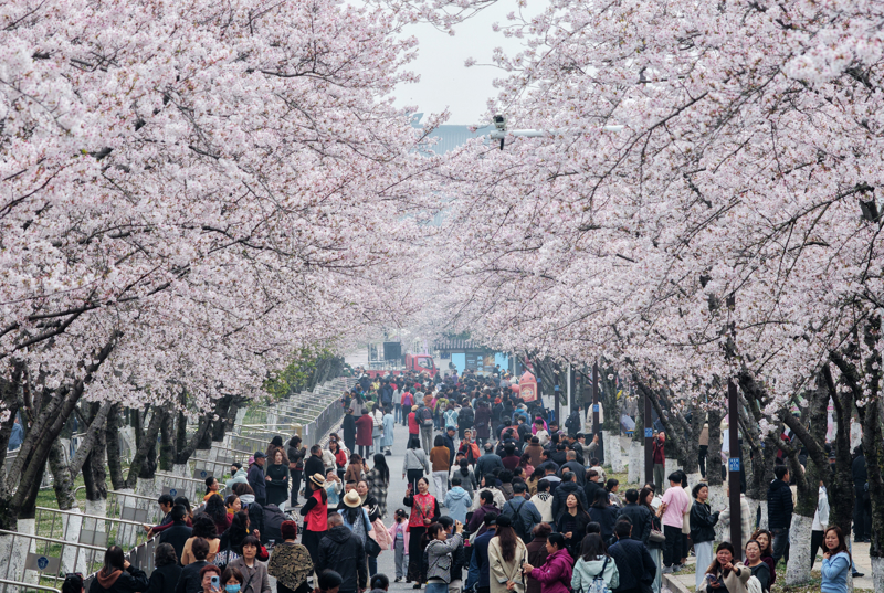 3月31日,搭客在江苏省扬州市鉴真路上的“樱花正途”赏樱游玩(无东谈主机像片)。 新华社发(孟德龙摄)